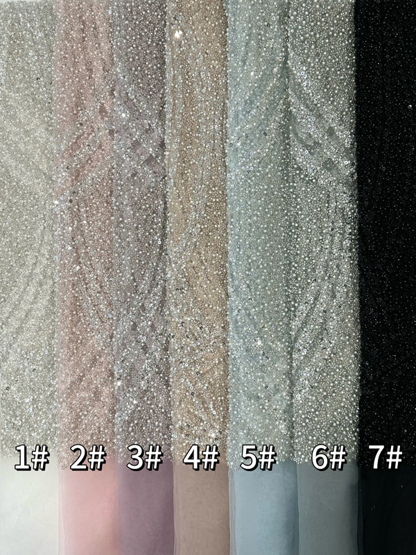 Currently, the trend in beaded fabric for wedding dresses is all about blending elegance with personality. While traditional white beads remain popular, more designers are experimenting with colored beads and even gemstone-like beads to add a touch of luxury. Customization is also on the rise, with gowns tailored to reflect the bride’s personal preferences and wedding theme, ensuring each dress is truly one-of-a-kind.
