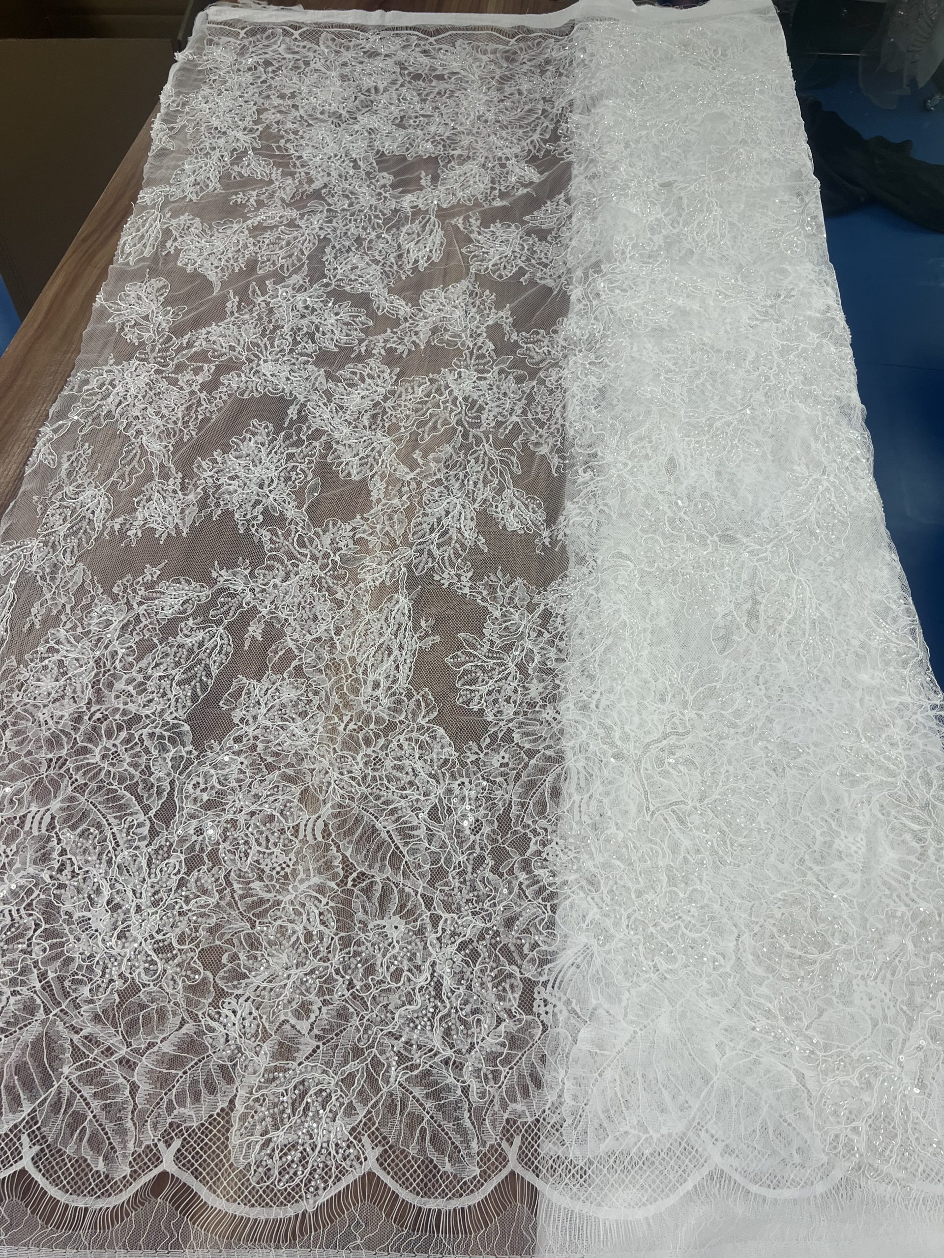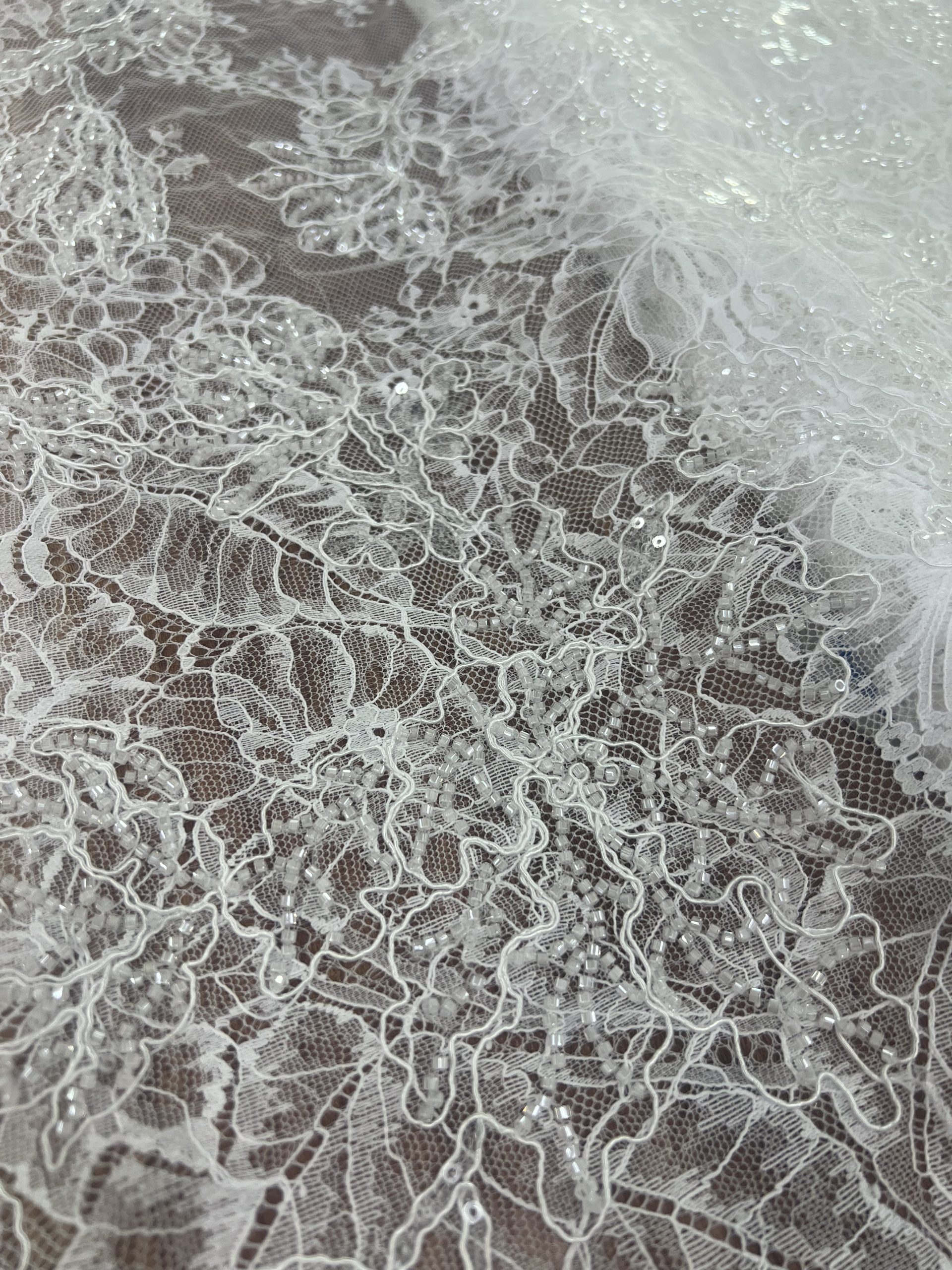 Bridal Chantilly Lace for Wedding Dress,Our premium beaded lace fabric is delicately crafted with exquisite embroidery, shiny sequins and elegant pearls. It features a soft, lightweight base with three-dimensional floral patterns and handmade beading details, bringing a romantic, luxurious and glamorous look to any garment.
