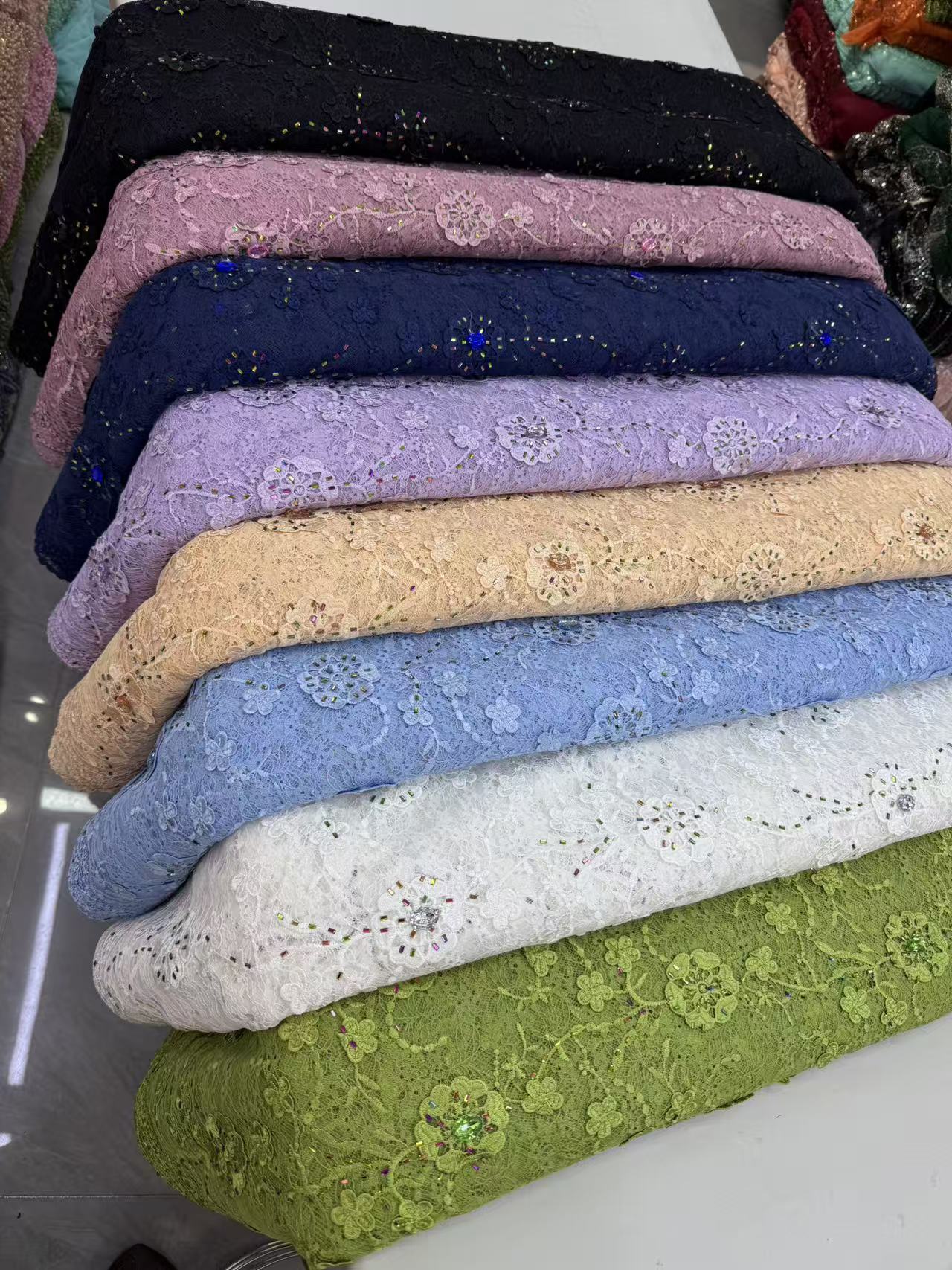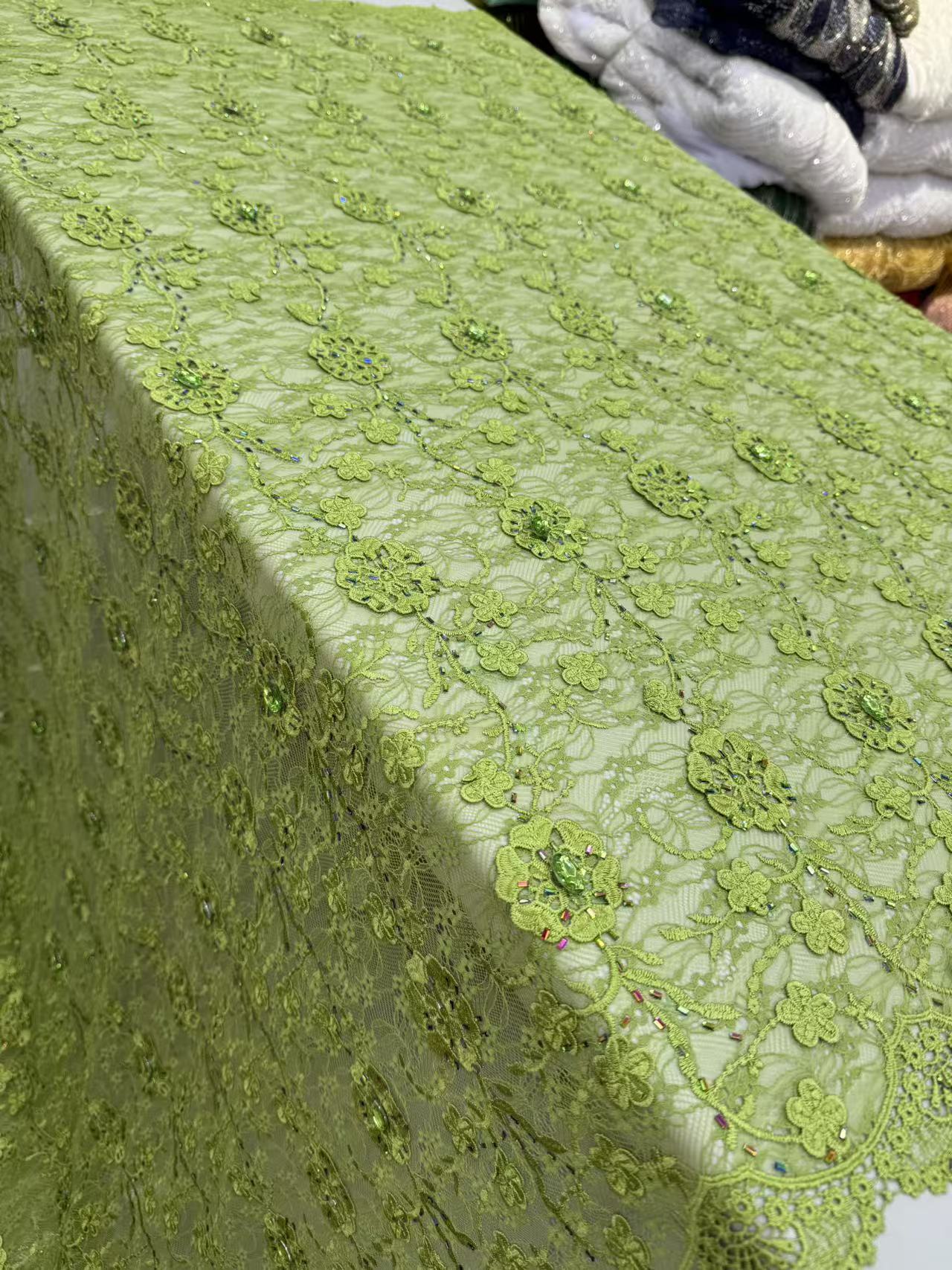 Chantilly beaded Lace for Wedding Dress ,Our premium beaded lace fabric is delicately crafted with exquisite embroidery, shiny sequins and elegant pearls. It features a soft, lightweight base with three-dimensional floral patterns and handmade beading details, bringing a romantic, luxurious and glamorous look to any garment.