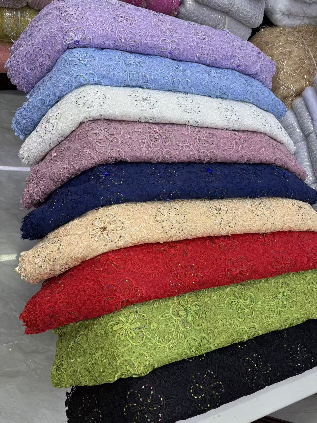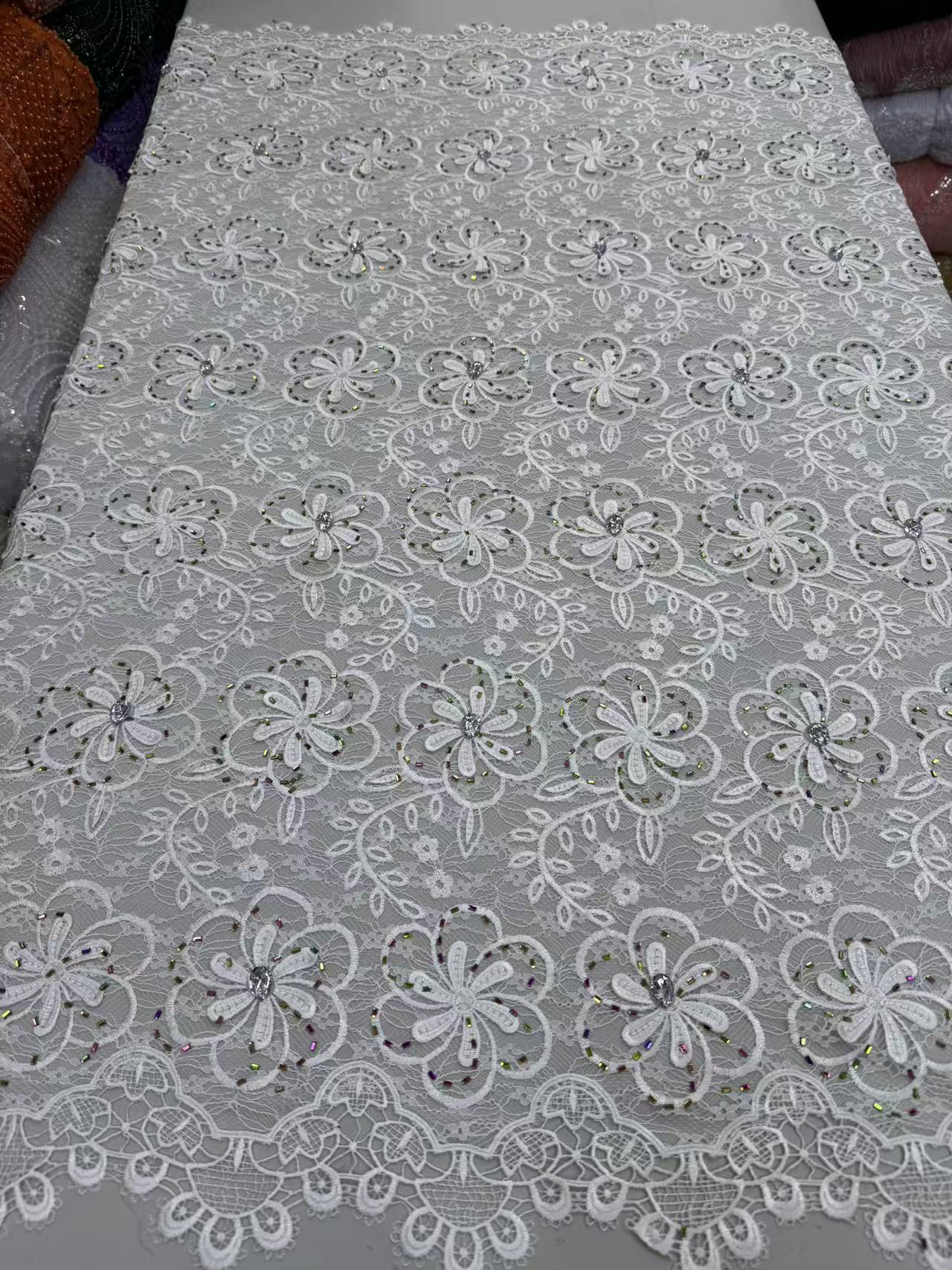 Chantilly Lace Beaded Embroidery Fabric ,Our premium beaded lace fabric is delicately crafted with exquisite embroidery, shiny sequins and elegant pearls. It features a soft, lightweight base with three-dimensional floral patterns and handmade beading details, bringing a romantic, luxurious and glamorous look to any garment.