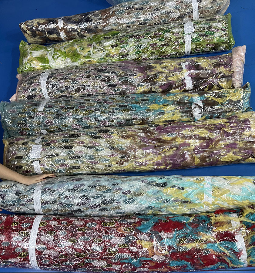 Feather beaded fabrics combine the lightness of feathers with the sparkle of beads. High-quality feathers are carefully selected and sanitized to ensure they are soft, clean, and durable. The beads, made from materials like glass, faux pearls, and crystals, are sewn onto the fabric by hand or machine. This meticulous process ensures each feather and bead is securely attached, giving the fabric a rich, layered look.