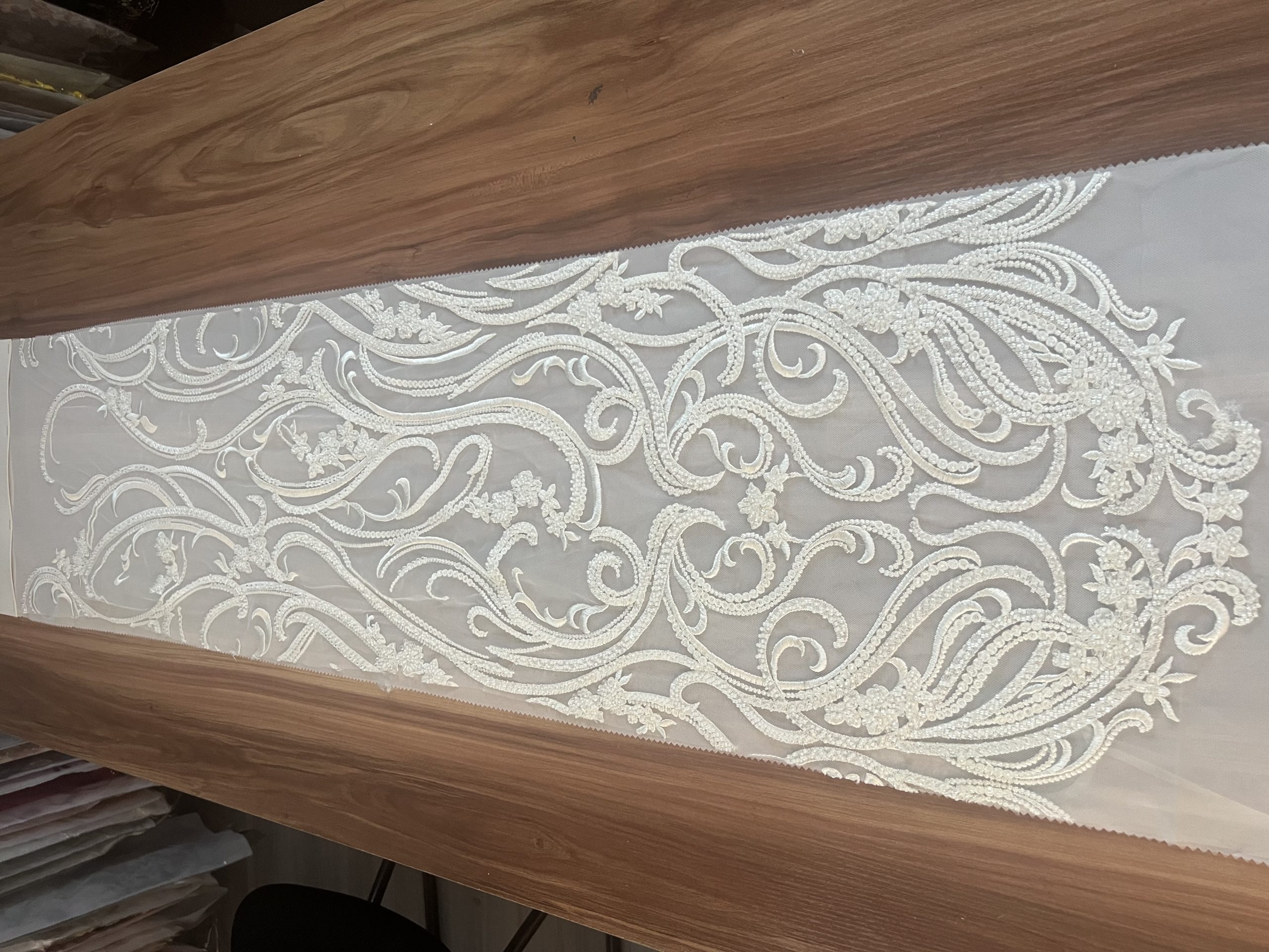 As a designer who specializes in handmade bridal white embroidery lace, I know how important it is to choose the right materials, and embellishments to bring a bridal gown to life. One of the most captivating elements in today’s bridal fashion, is the use of white beaded fabrics. These materials, with their delicate sparkle and intricate patterns, add a touch of glamour and sophistication to any wedding dress. In this blog, we’ll explore the inspiration behind white beaded fabrics, how they’re used in wedding dress design, and the current trends in this timeless fashion element.