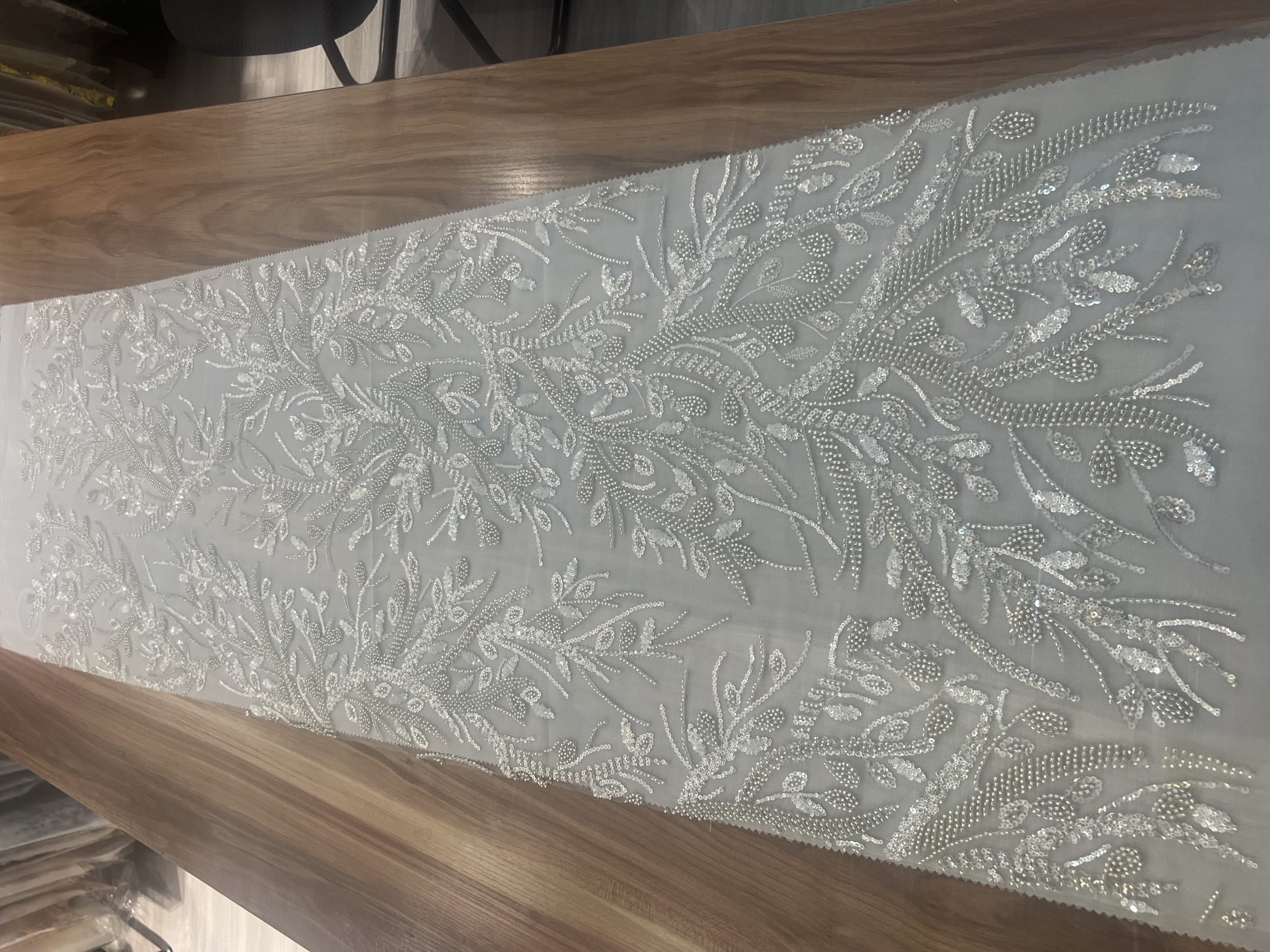 As a designer who specializes in High quality beaded fabric, I know how important it is to choose the right materials, and embellishments to bring a bridal gown to life. One of the most captivating elements in today’s bridal fashion, is the use of white beaded fabrics. These materials, with their delicate sparkle and intricate patterns, add a touch of glamour and sophistication to any wedding dress. In this blog, we’ll explore the inspiration behind white beaded fabrics, how they’re used in wedding dress design, and the current trends in this timeless fashion element.