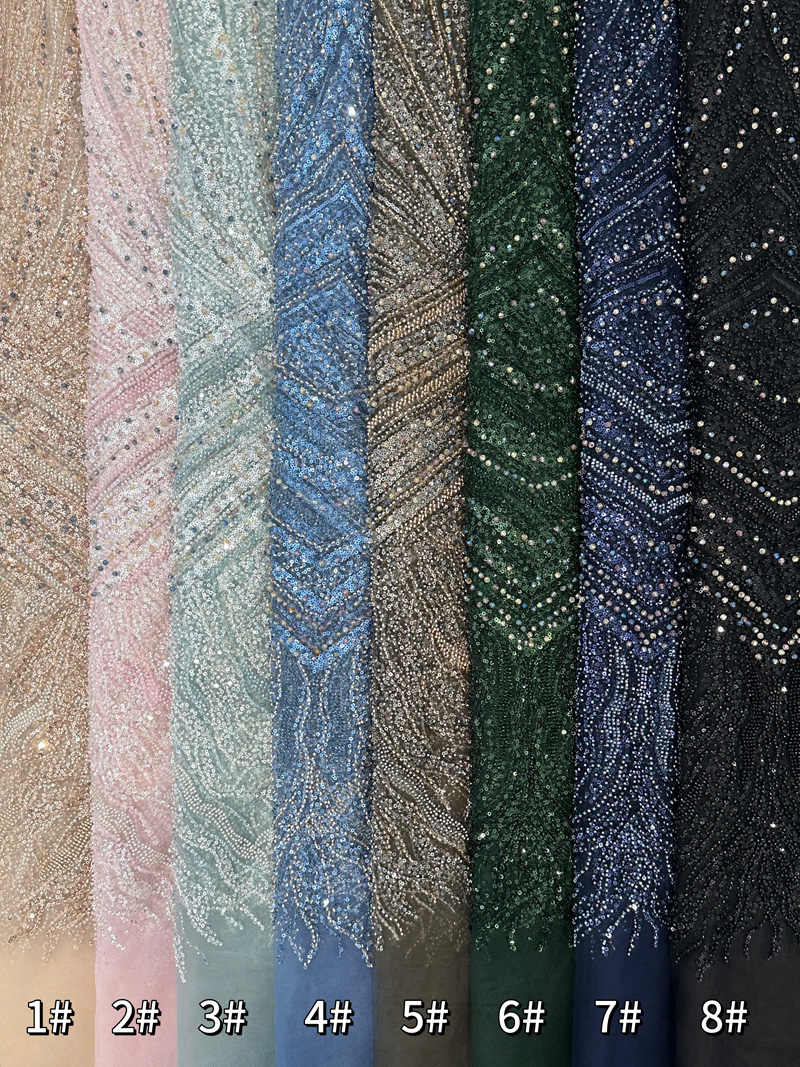 Currently, the trend in beaded fabric for wedding dresses is all about blending elegance with personality. While traditional white beads remain popular, more designers are experimenting with colored beads and even gemstone-like beads to add a touch of luxury. Customization is also on the rise, with gowns tailored to reflect the bride’s personal preferences and wedding theme, ensuring each dress is truly one-of-a-kind.