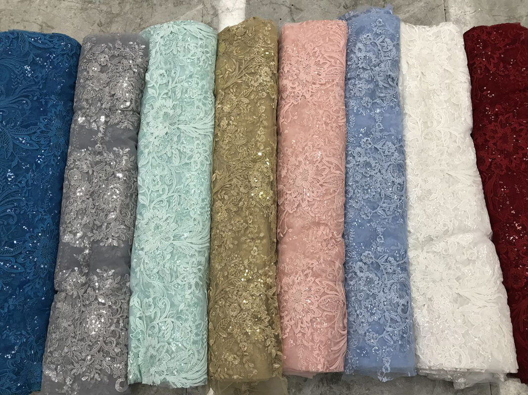 Corded sequins Lace is traditional lace enhanced with additional corded threads that outline the lace patterns, making them more three-dimensional and detailed. It has the following characteristics: