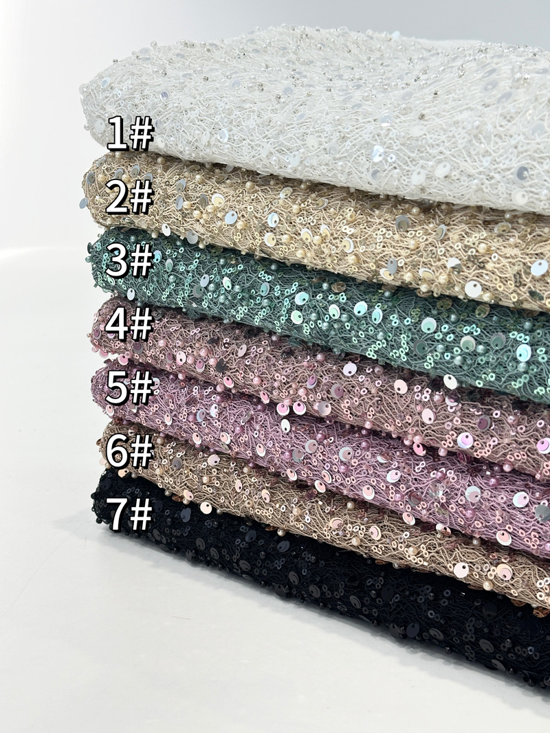 The inspiration for Latest sequins lace embroidery wedding lace often comes from nature and art. Think of dew drops sparkling in the sunlight or shells glistening on the beach—these natural wonders inspire designers to create beaded patterns that bring a gown to life.