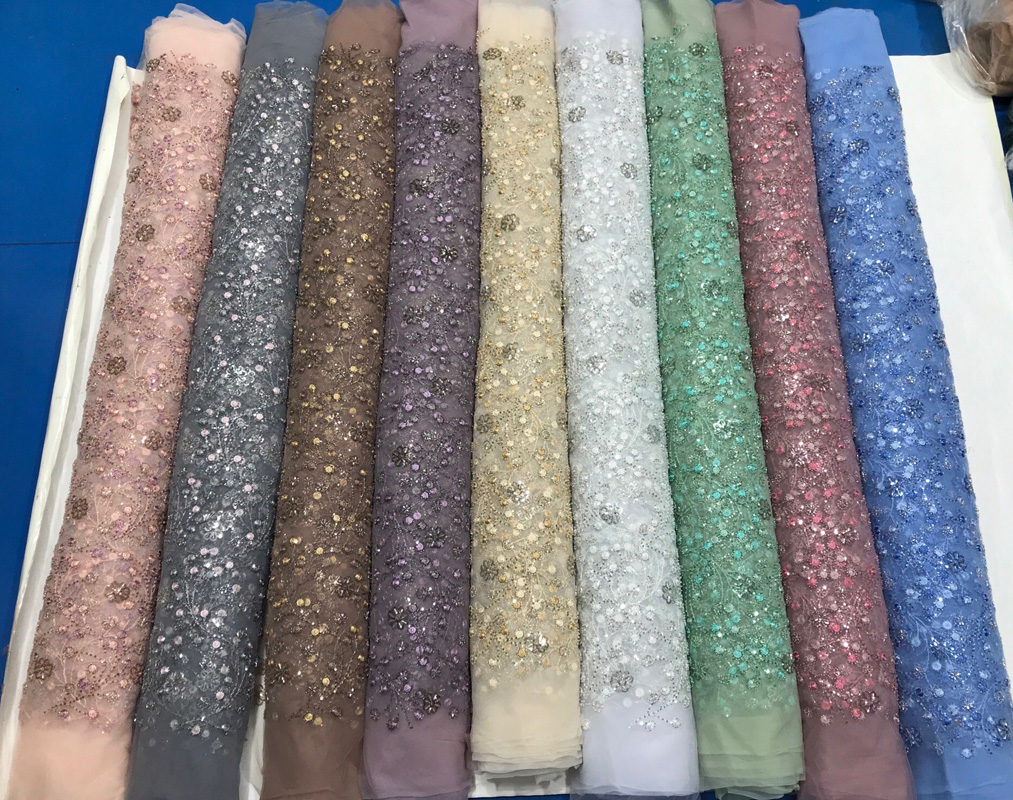 Currently, the trend in beaded fabric for wedding dresses is all about blending elegance with personality. While traditional white beads remain popular, more designers are experimenting with colored beads and even gemstone-like beads to add a touch of luxury. Customization is also on the rise, with gowns tailored to reflect the bride’s personal preferences and wedding theme, ensuring each dress is truly one-of-a-kind.