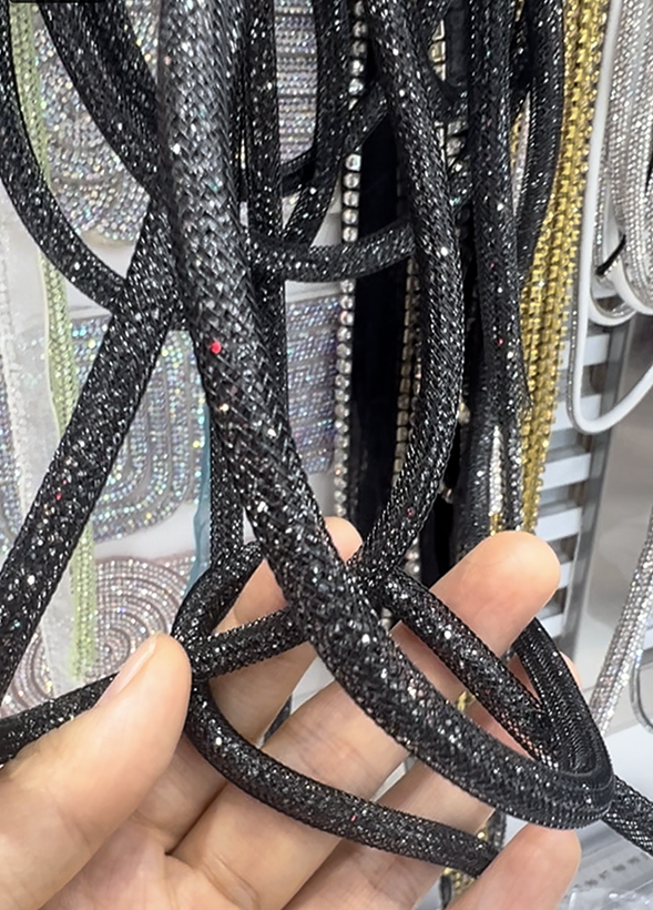 Rhinestone rope consists of numerous tiny rhinestones embedded in a flexible rope-like material. These rhinestones are typically made from high-quality glass or resin and are meticulously cut to reflect light beautifully. The rope material is usually made from high-strength nylon or polyester fibers, ensuring flexibility and durability while providing comfort when worn. During production, each rhinestone is precisely fixed onto the rope, creating a uniform and dazzling effect.