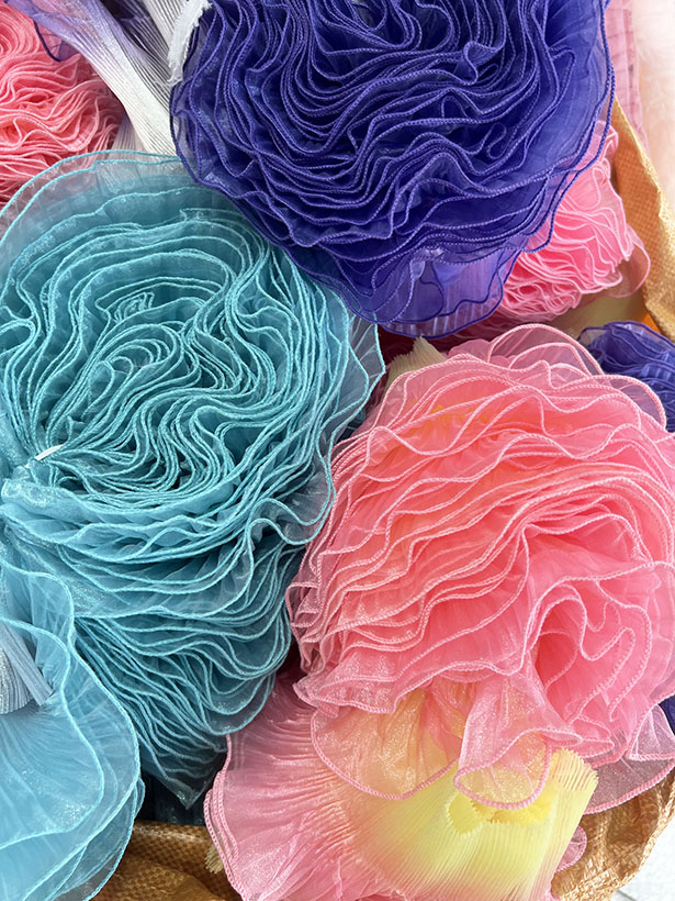 Ruffles trims made with organza tulle fabric ribbons also known as frills, are created by folding and stitching fabric to form wavy or layered effects. This design technique dates back to 16th-century European court fashion, where ruffles trims were often used on collars and sleeves to symbolize elegance and nobility. Over time, ruffles have become a key element in various types of clothing, especially in dress design.