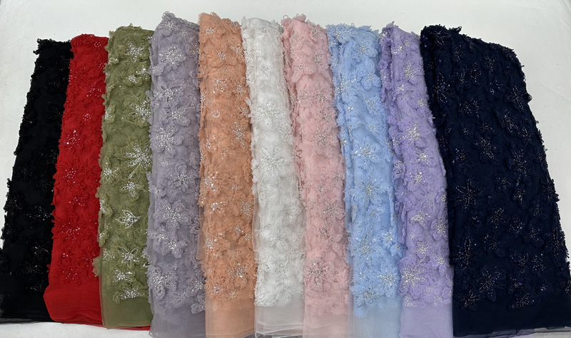 The inspiration for Unique floral beaded 3d lace fabric often comes from nature and art. Think of dew drops sparkling in the sunlight or shells glistening on the beach—these natural wonders inspire designers to create beaded patterns that bring a gown to life.